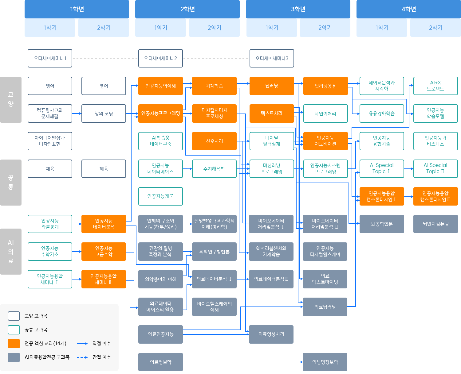 교양/공통과목 필수교과목 단일전공 - 오디세이세미나3, 인공지능융합캡스톤디자인 | 복수전공 - 인공지능융합캡스톤디자인 | 23학번 이전 입학생은 인공지능융합캡스톤디자인 | 또는 Ⅱ 이수 권장. 24학번 이후 입학생은 인공지능융합캡스톤디자인 | 이수 필수. 교양/공통/AI의료 교양/공통/AI로봇 교양/공통/AI기술경영