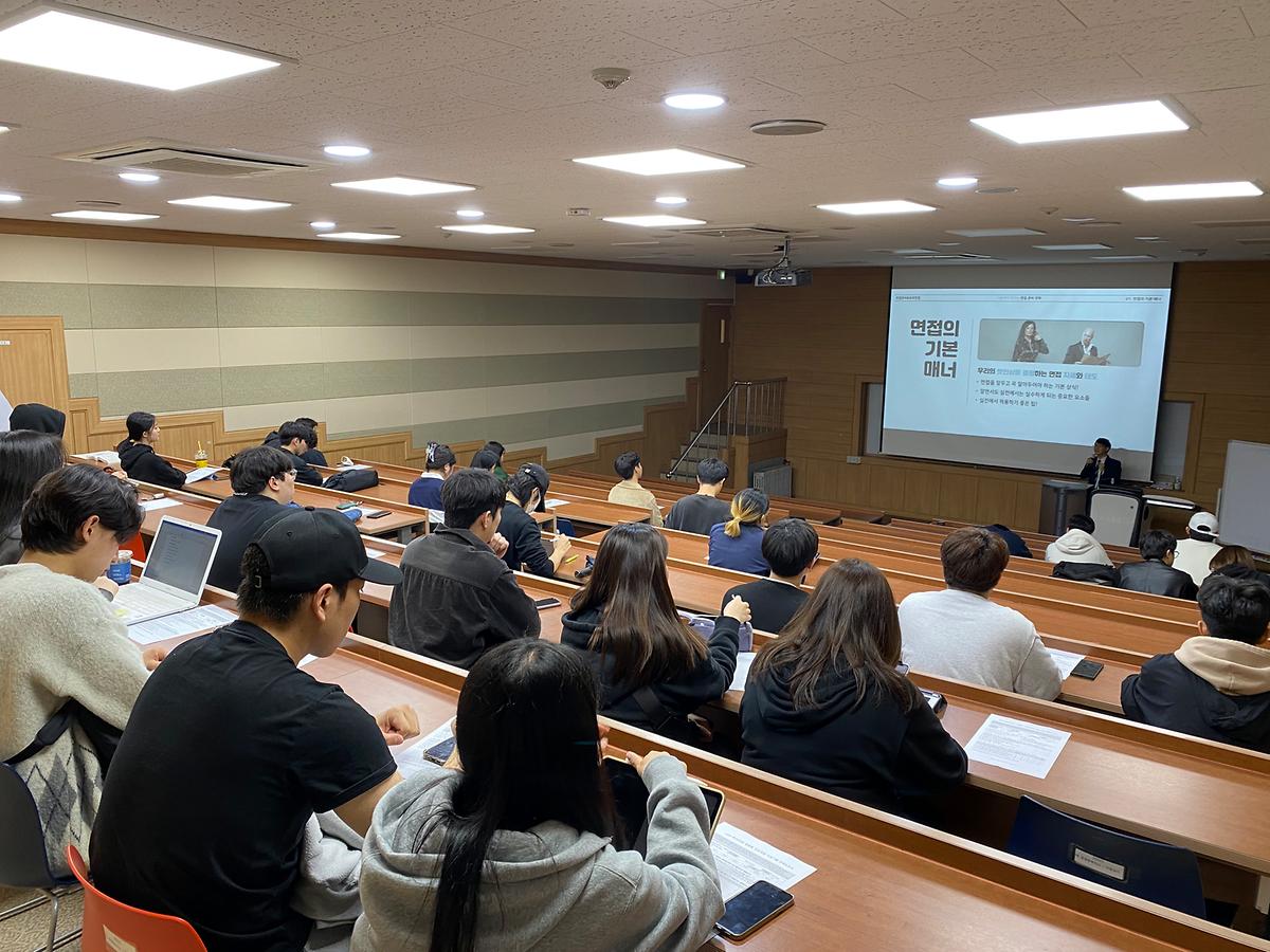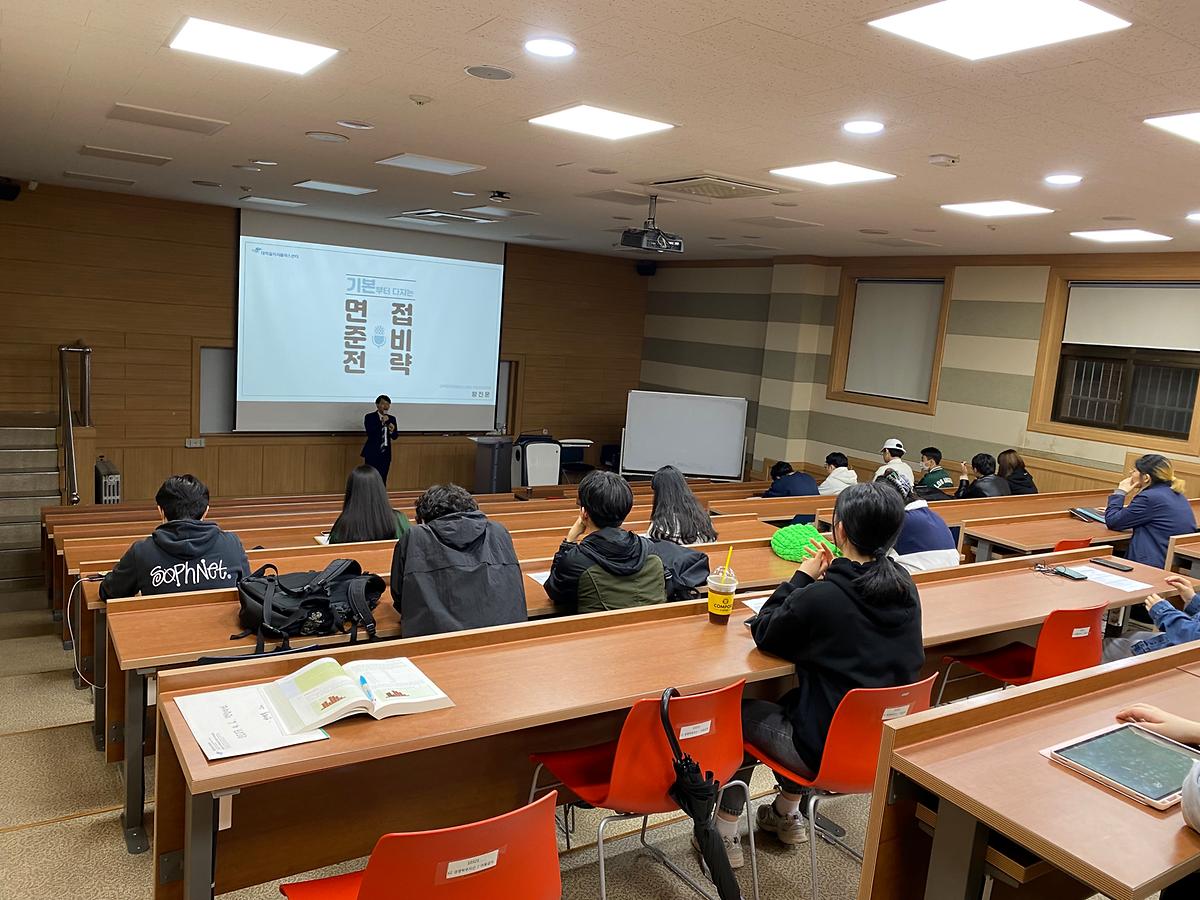 상황별 구체적인 질문과 답변 전략 등을 꼼꼼히 가르쳐주셨고 특히 취업 전선에 맞닿아 있는 학생들은 열심히 필기하고 질문하며 특강을 수강하였습니다.