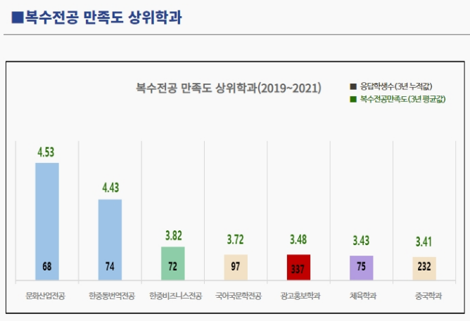 중국학과 - 100명 이상 대규모 복수전공 운영 학과 중 2위(1위: 광고홍보학과) / 전체 7위