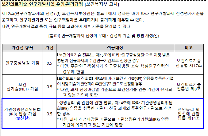2)조건: IRB 인증을 취득한 기관이 신규 과제의 주관연구기관으로  신청한 경우, 가산점 적용
