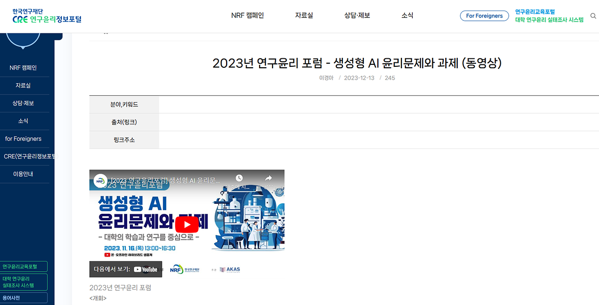 2023년 연구윤리 포럼 영상을 공유합니다.