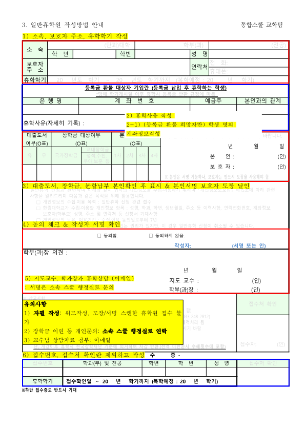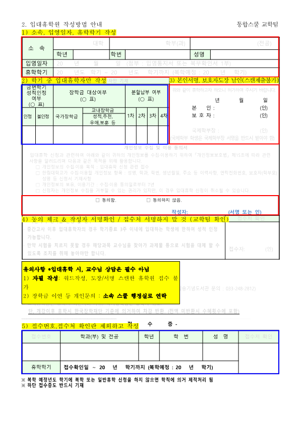 - 휴학원 자필 서명 및 보호자 도장 날인 필수!