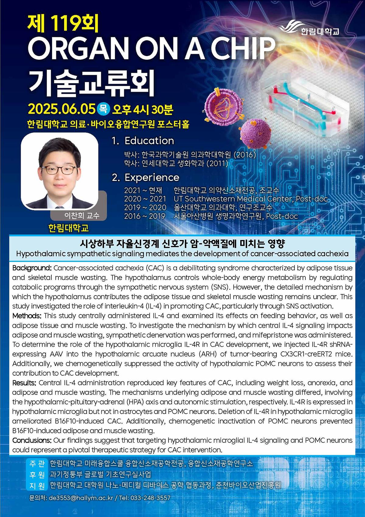 이번 기술교류회에서는 한림대 이찬희 교수를 연사로 모시고 '시상하부 자율신경계 신호가 암-악액질에 미치는 영향'을 주제로 강연이 진행되었다.