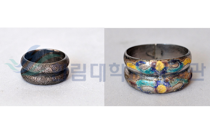 왼쪽에 있는 가락지의 표면에는 박쥐 무늬를 음각(陰刻)으로 새겼고, 오른쪽에 있는 가락지는 박쥐 무늬를 칠보 유약을 입혀 구워 장식하였습니다.