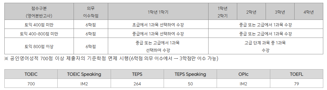 ① ~2022학번 이전 : 영어1,2 또는 대학영어1,2,3,4를 포함하여 영어분반고사 성적에 따라 글로벌소통 영역에서 단계에 맞는 초급, 중급, 고급 표기된 과목으로 2과목 이상(6학점 이상)