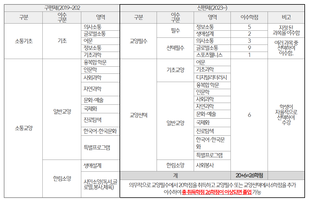 ※ 의과대학 및 글로벌융합대학은 교양필수·교양선택 이수기준은 따로 정함.(단과대학 교학팀 문의)