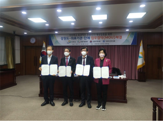 * 강원도와 도내 의료계가 18일 도청에서 코로나19 예방 접종을 위한 업무 협약에 서명했다.