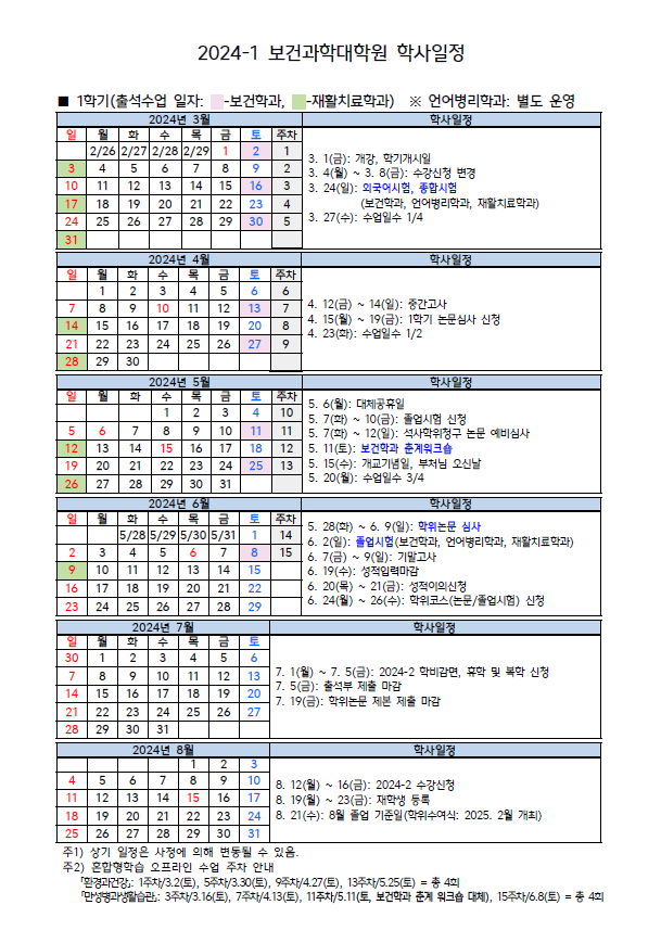 2024-1 보건과학대학원 학사일정(3. 6. 보건학과 춘계워크숍 일정 수정)