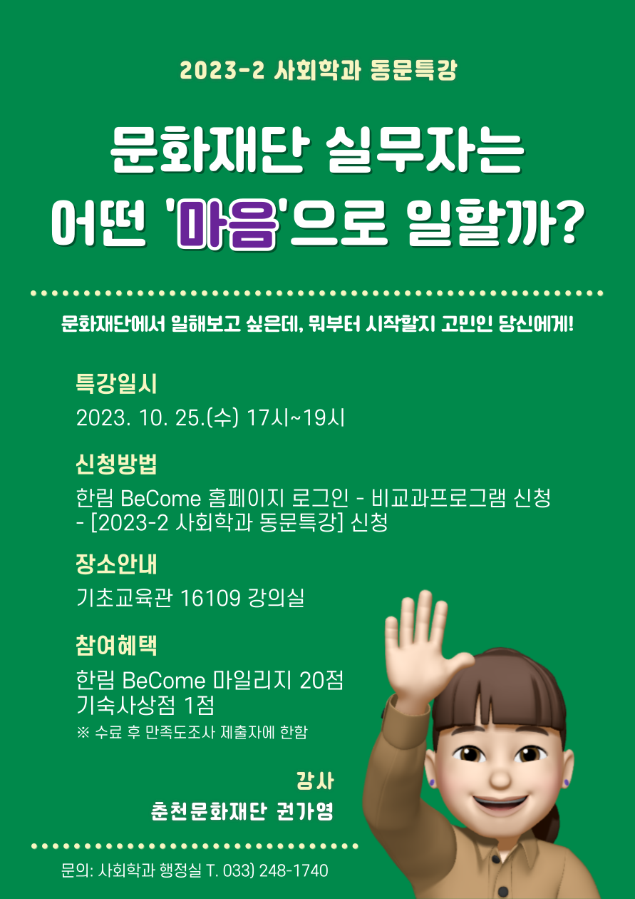 3. 신청방법: 한림 BeCome 홈페이지 - 비교과프로그램 신청 - [2023-2 사회학과 동문특강] 신청