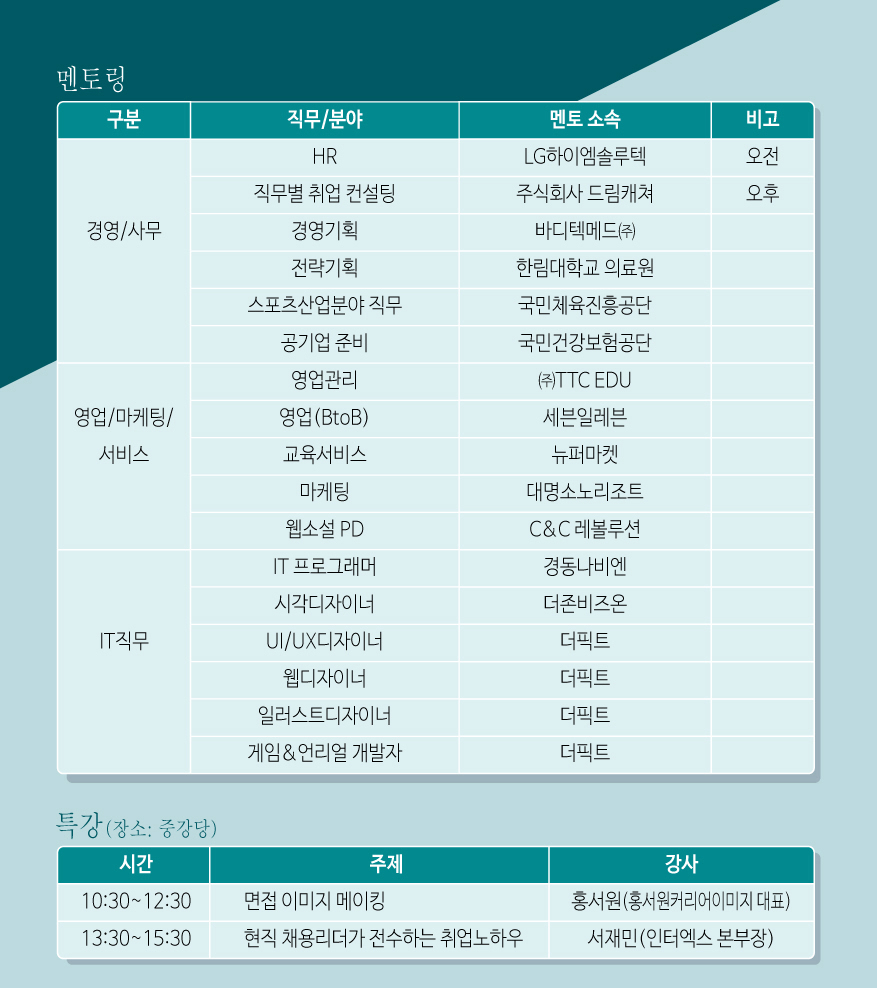 - 부스별 동문/현직자를 만나 직무정보, 취업준비 방법 등 정보습득