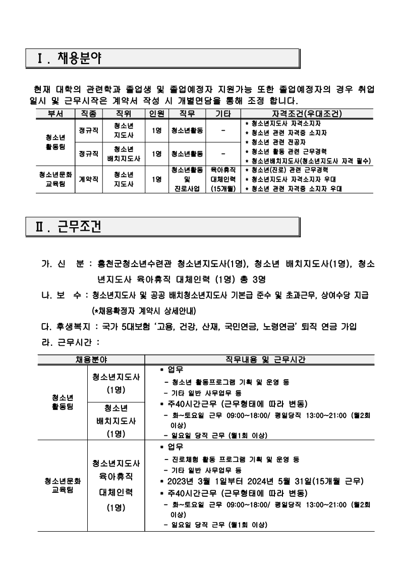 2023년 홍천군청소년수련관 실무자 공개채용 공고